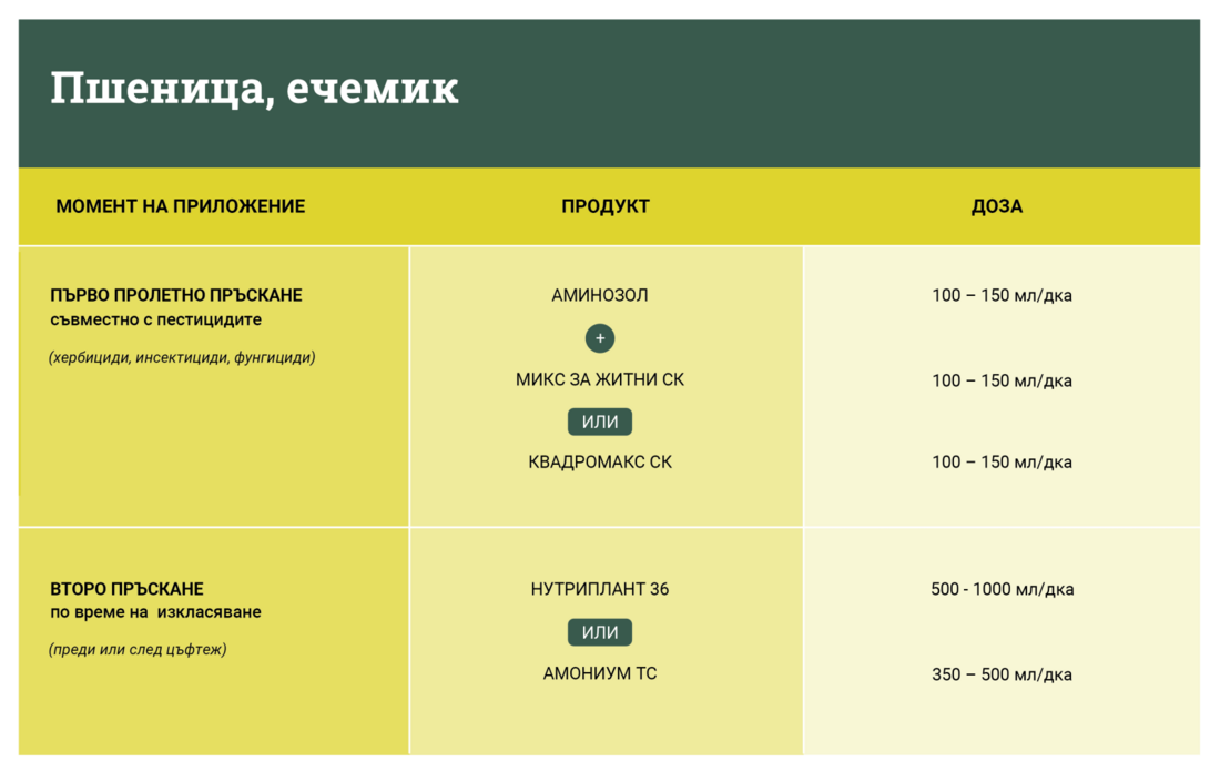 Това прави периода преди цъфтеж (до 10% цъфнали растения) или след цъфтеж (90% прецъфтели растения) най-подходящият момент за листно приложение на Нутриплант 36 или Амониум ТС, защото по този начин се задоволяват директно нуждите на растенията в критичен етап от развитието им. Резултатът е по-добър добив, по-висока хектолитрова маса и повишено съдържание на протеин – показатели, които имат ключово значение за качеството и рентабилността на продукцията.